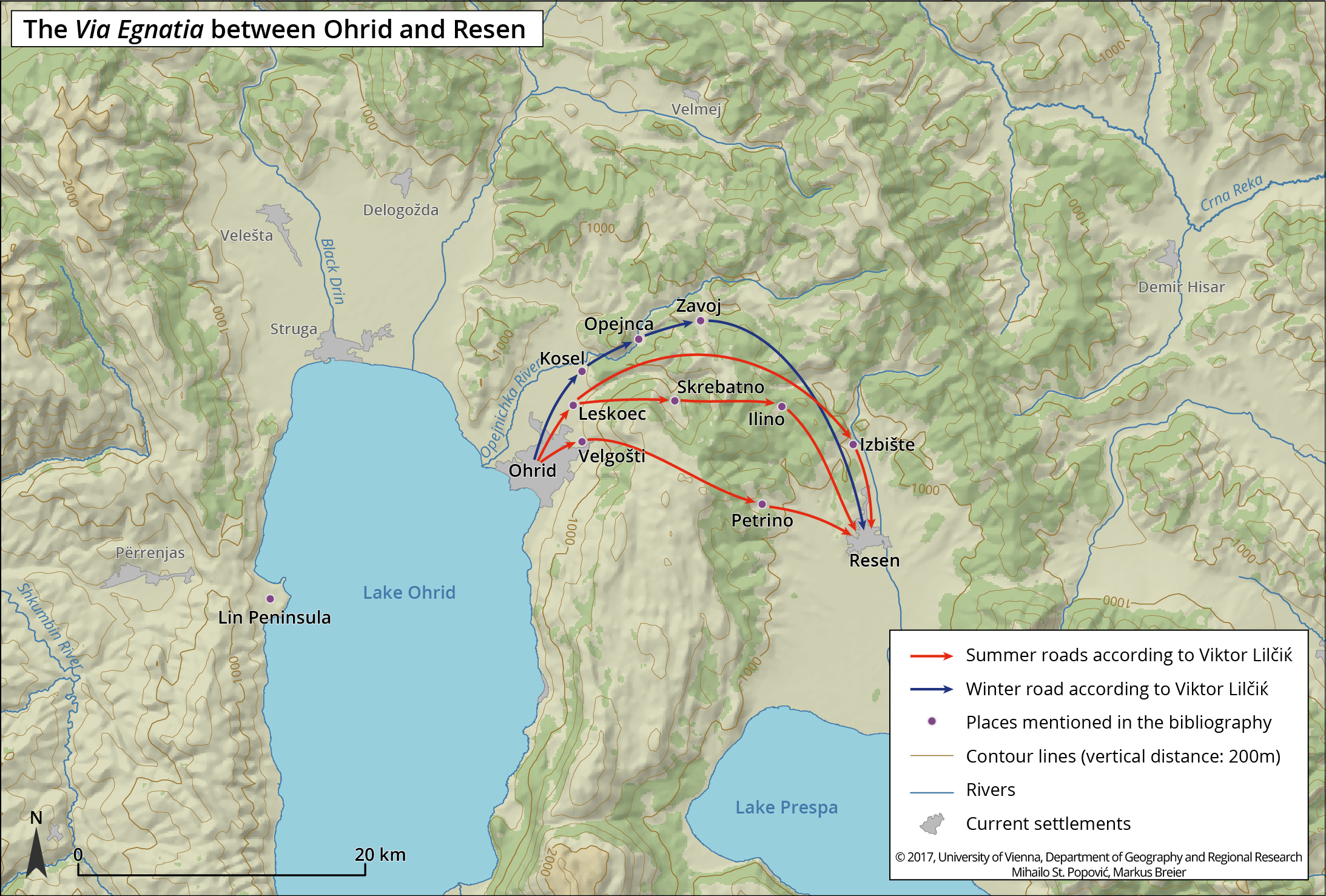 Although a vast variety of secondary literature has been published on the Via Egnatia, some parts of its route still remain obscure, for instance the section between Ohrid, Resen and Bitola. The archaeologist Viktor Lilčikj Adams has argued for a multi-layered approach to this question. He distinguishes for the section Ohrid – Resen between a summer and a winter road. The summer road led from Ohrid to Velgošti and via the mountain of Istok (1661 m altitude) and the village of Petrino to Resen, which is the most direct and shortest way between Ohrid and Resen. The winter road offers three variants: The first ran from Ohrid via Kosel, Opejnca, Zavoj, the pass of Bukovo (1207 m altitude) to Resen, which is the longest and safest section. The second variant connected Ohrid, Leskoec, circumvented the elevation of Bigla (1228 m altitude) to the South-East of Opejnca, crossed the pass of Bukovo and reached Resen via Izbište. The third led from Ohrid to Leskoec, Skrebatno, Ilino and Resen.