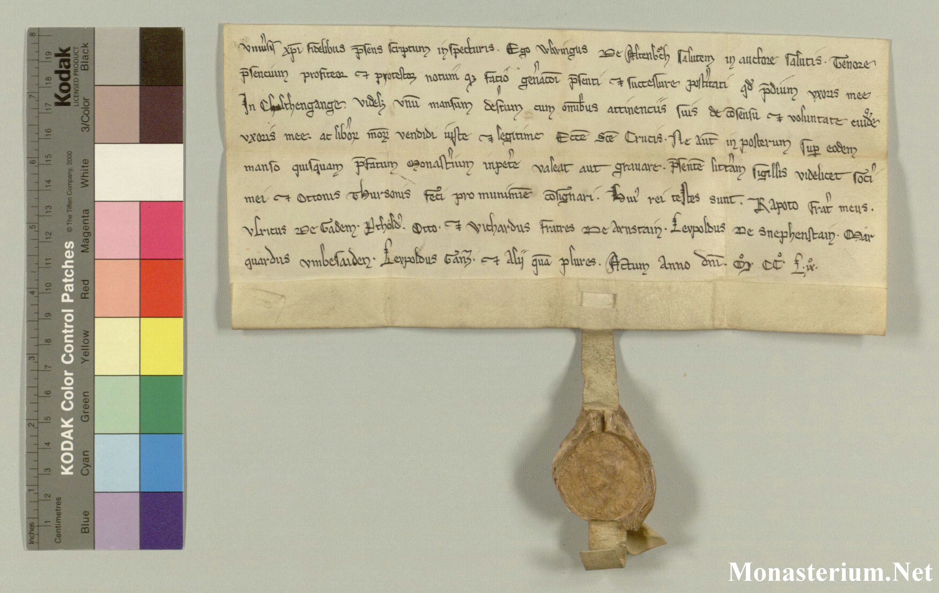 | Heiligenkreuz, Urkunde, 1284 | Source | Im Juni 1284 verkaufte Hugo Tuers von Lichtenfels dem Stift Heiligenkreuz eine Manse zu Kaltengang, dann einen Garten und eine Wiese daselbst (mansum unum situatum in Chaltengange). |