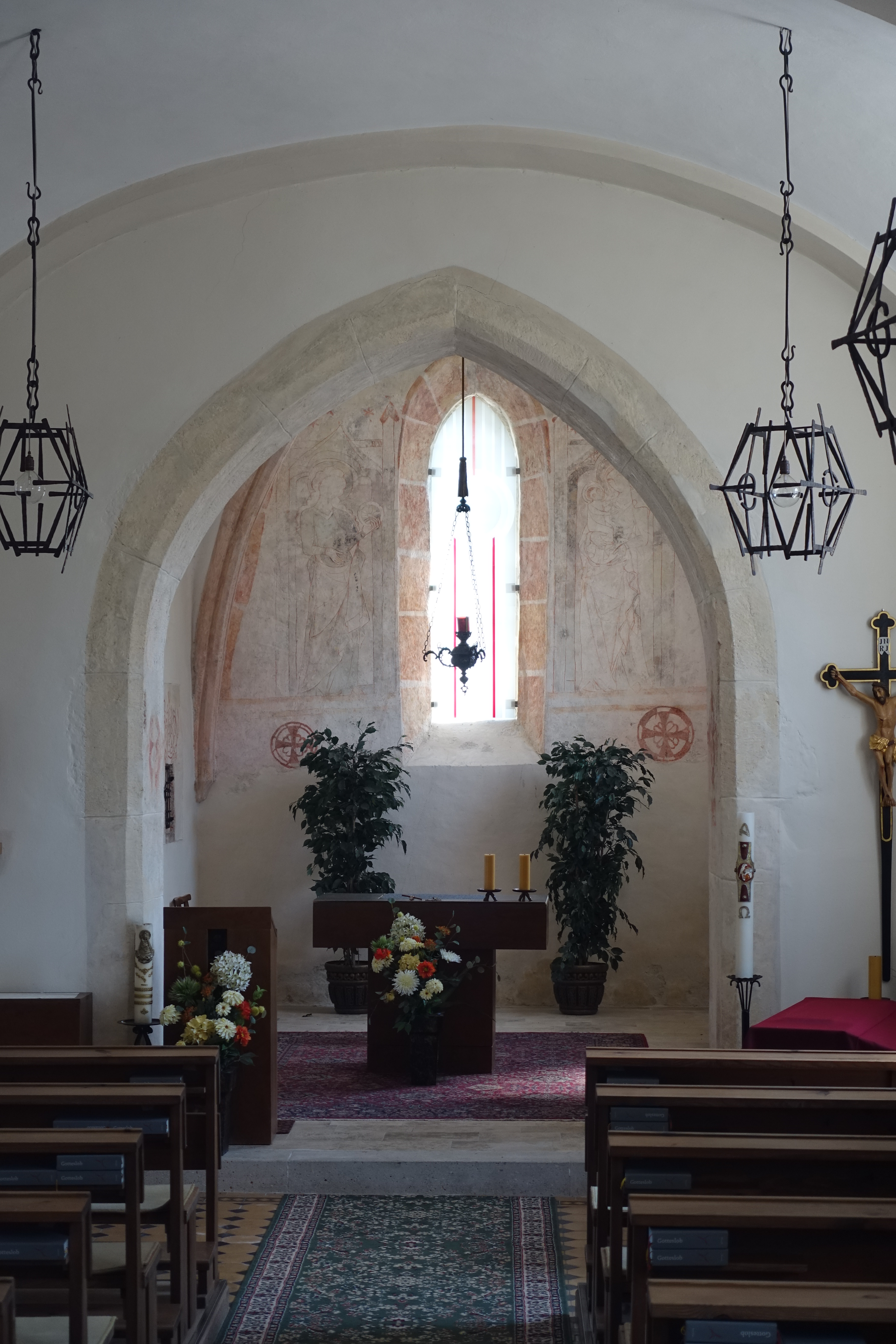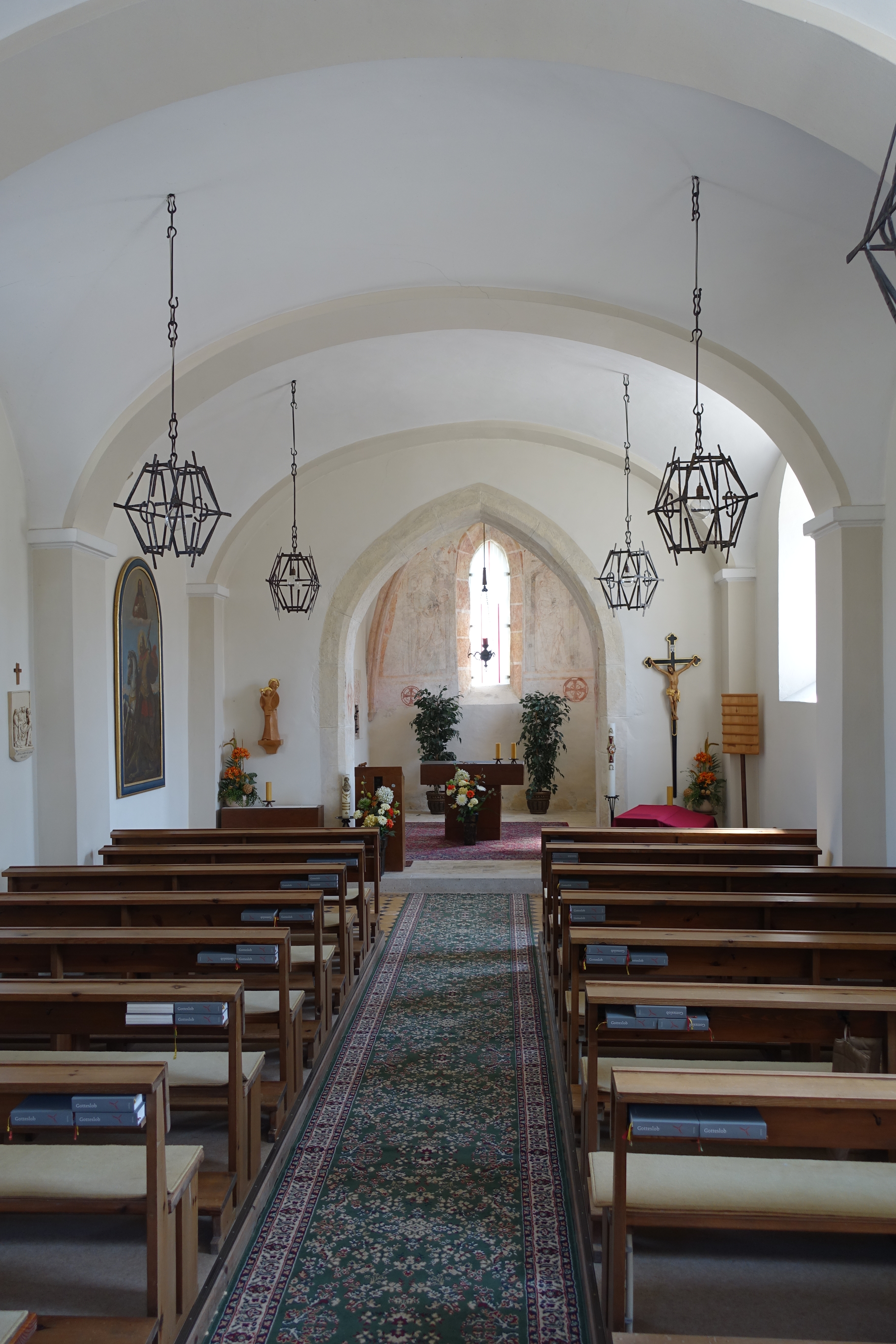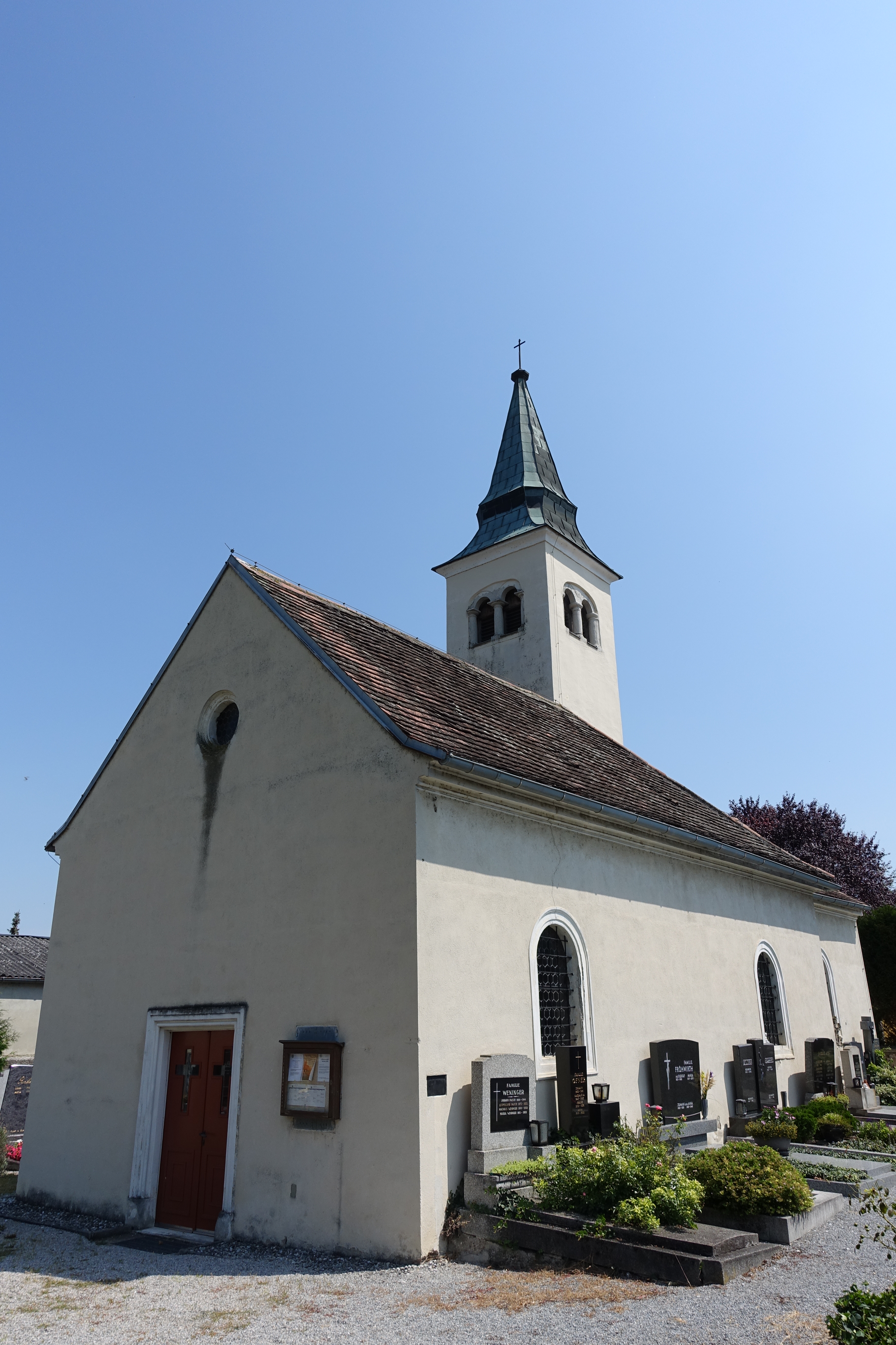 Bei der Kirche des Heiligen Georg handelst es sich um eine frühgotische Chorquadratkirche. Sie wurde um 1320 als Kapelle erbaut und hat ein barockisiertes Langhaus mit einem nördlich angestellten Turm (16./17. Jahrhundert, Schlitzfenster). Sie wurde 1976/77 restauriert. Die Kirche weist Rundbogenfenster des 18. Jahrhunderts auf. Am Chor sind ein einbahniges, spitzbogiges Ostfenster sowie ein vermauertes Lanzettfenster mit kleeblattbogigem Spitzbogen in tiefer Trichterlaibung um 1320 an der Nordseite zu sehen. Das Lanzettfenster wurde 1976/77 freigelegt. Das gotische Südportal wurde vermauert. Das Langhaus ist im Inneren dreijochig. Gedrückter spitzbogiger Triumphbogen (Aussparung für ehemalige Chorschranke sichtbar). Das Chorquadrat weist ein Kreuzrippengewölbe auf (kleiner Schlußstein, um 1320, Rest von Rosette sichtbar). An der Nordseite rechteckiges Steingewändeportal des 17. Jahrhunderts (?) zur gewölbten Sakristei (Turmerdgeschoß). Frühgotische Wandmalerei an der Stirnseite des Chores (Heilige Katharina und Maria mit Kind in architektonischer Rahmung, seitlich je eine Sakramentsnische mit ornamentaler Rahmung bzw. Übergiebelung, um 1320/30). Vier gotische Weihekreuze.