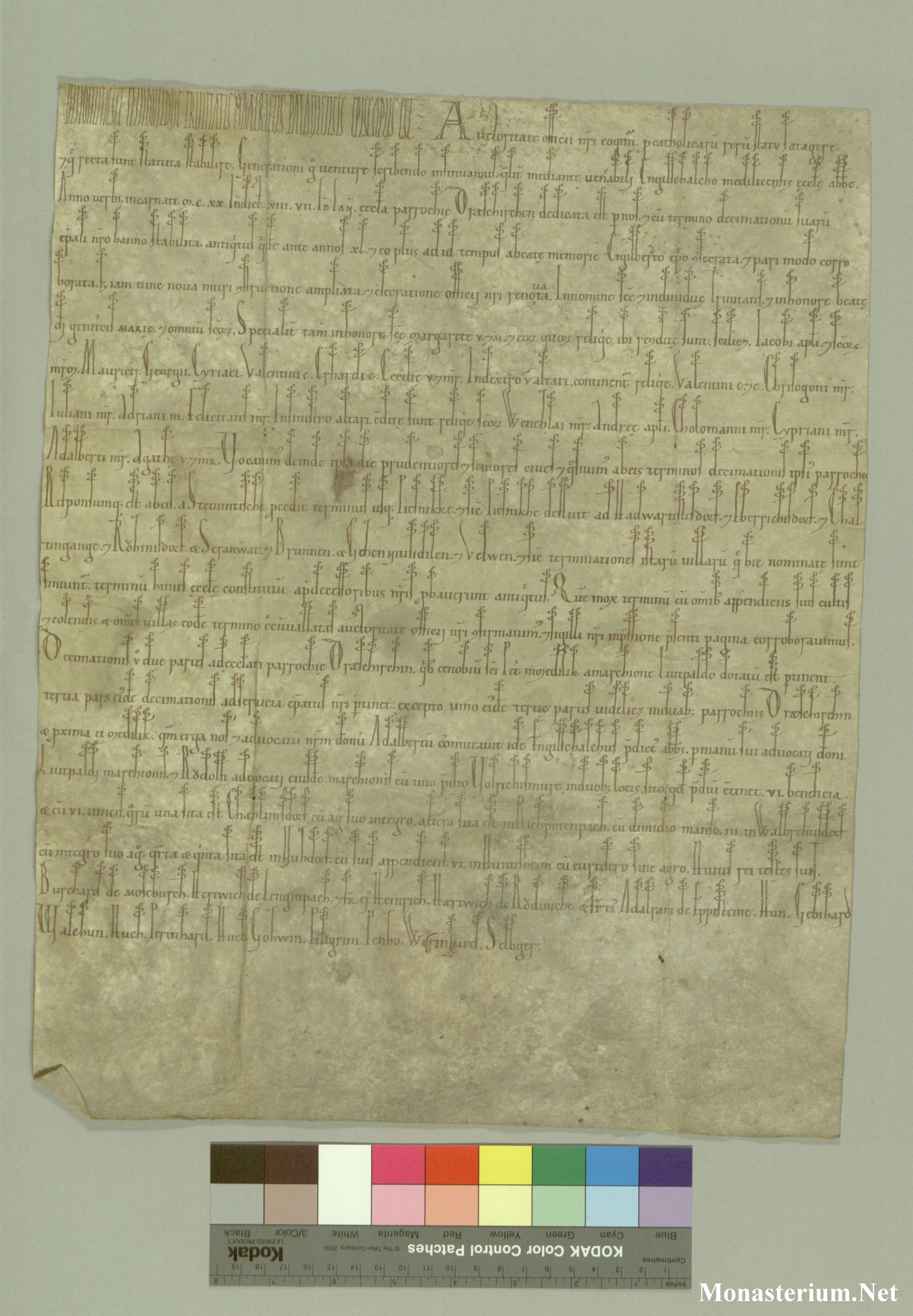 | Neuweihe der Pfarrkirche von Traiskirchen und der Erhebung der alten Grenzen dieser Pfarre, Urkunde, 1120a, Edition des lateinischen Texts (Keiblinger) | Source translation | In nomine sancte et indiuidue trinitatis Odalricus Patauiensis episcopus est. Auctoritate officii nostri cogimur pro catholicarum rerum statv satagere, et que recta sunt statuta stabilire. Generationi ergo uenture scribendo insinnamus. qualiter mediante uencrabilj Engilschalco medilicensis ecclesie abbate. Anno uerbi incarnati. M. C. XX. Indiet. XIII. VII. Id. Jan. ecclesia parrochie Dræschirchen dedicata est per nos. et cum termino decimationum suarum | episcopali banno stabilita. antiquitus quidem ante annos xl. et eo plus ad id tempus abeate memorie Eigilberto episcopo consecrata. et parl modo corro | borata. sed iam tune noua muri constructione ampliata. et consecratione officij nostri renonata. In nomine sancte et indiuidue Trinitatis. et in honore beate | dej genitricis MARIE. et omnium sanctorum. Specialiter tamen in honore sancte Margarete V. et M. et eorum quorum reliquie ibi recondite sunt. scilicet. Jacobi apostoli. et sanctorum | mrm. Mauricij. Georgii. Cyriaci. Valentini c. Erhardi e. Cecilie v. et mr. Indextro vero altari. continentur reliquie. Valentini e. et c. Chrisogoni mr. | Juliani mr. Adriani m. Felicitatis mr. Insinistro altari condite sunt reliquie sanctorum Wenezlai mr. Andree apostoli. Cholomanni mr. Cypriani mr. | Adalberti mr. Agathe v. et mr. Uocauimus deinde ipsa die prudentiores et seniores ciues et quesiuimus ab eis terminos decimationis ipsius parrochie. | Responsumque est ab eis. a Steinintische procedit terminus usque Piesnikke, et sicut Piesnikhe défluit ad Hadwartistisdorf. et Eberrichisdorf. et Chal | tingange, et Rözinisdorf. et Scranwat. et Brunnen, et Gezen Nuisidelen. et Velwen. et sic terminationes istarum uillarum que hic nominate sunt | finiuntur. terminum huius ecclesie constitutum apredecessoribus nostris probauerunt antiquitus. Quem mox terminum cum omnibus appendiciis suis cultis | et colendis, et omnes nillas eodem termino circumuallatas auctoritate officij nostri confirmauimus. et sigilli nostri impressione presenti pagina corroborauimus. | Decimationis vero due partes adecclesiam parrochie Dræschirchin. quibus cenobium sancti Petri in Medilik amarchione Luitpaldo dotatum est pertinent. | tertia pars eiusdem decimationis ad seruicium episcopatus nostri pertinet. excepto uino eiusdem tertie partis uidelicet in duabus parrochiis Dræschirchin | et proxima ei Medilik. quam erga nos et aduocatem nostrum dominum Adalbertum commutauit idem Engilschalchus predictus abbas. per manum sui aduocatj domini | Luitpoldi marchionis. et Rôdolfi aduocatj eiusdem marchionis cum uno predio Volrichismure in duobus locis sito. quod predium continet. VI. beneficia. | et cum VI uineis. quarum una sita est Chæzlinisdorf cum agro suo integro. altera sita est in Richpotenpach. cum dimidio manso. III. in Walbrehtisdorf | cum integro suo agro. quarta et quinta sita est in Nuzdorf. cum suis appendiciis. VI. in Huntisheim cum curtifero sine agro. Huius rei testes sunt. | Burchard de Moseburch. Hertwich de Lenginpach. et frater eius Heinrich. Hærtwich de Rödiniche. et frater eins Adalram de Eppisteine. Hun. Gebihard. | Walchun. Huch. Perenhard. Huch. Gozwin. Piligrim. Penzo. Werinhart. Selbger. |