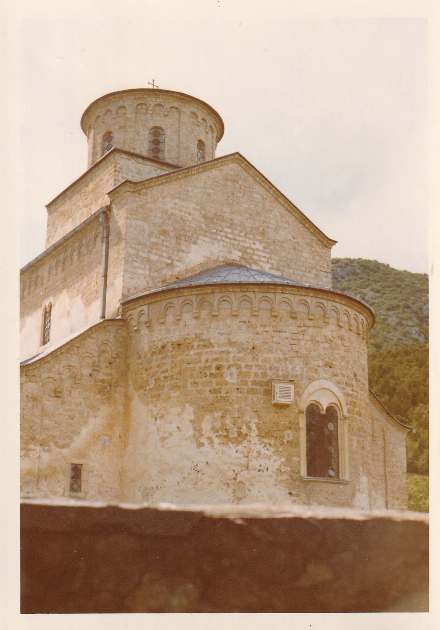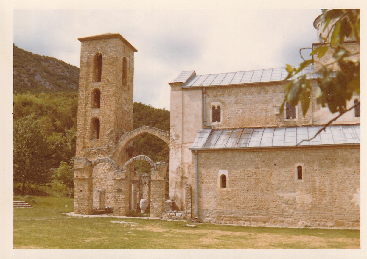 The Sopoćani Monastery is situated near the source of the river Raška in the region of Ras in the vicinity of the city of Novi Pazar. The church was built by the Serbian King Stefan Uroš I (reigned 1243-1276), the son of the Serbian King Stefan Prvovenčani (reigned 1196-1227) around 1260 (PJŠ Pam., 70 - sьzida že crьkovь Sopokjani). The exonarthex and a bell tower were added later, in the first half of the 14th century (resembling the Žiča Monastery). The church is a mausoleum of members of the royal Nemanjić members: the King's mother Anna Dandolo, Stefan Prvovenčani, Grand Duke Djordje and King Uroš I himself. It is a single nave edifice with three bays and a dome and has a three-partite semicircular apse as well as a narthex. On the sides of the narthex are separate chambers. On the outside, the edifice resembles a three-nave basilica (all side rooms, next to the altar, choirs and chapels are placed under one, single-pitched roof), which is also the element that distinguishes this building from the others of the Raška style group. The windows and portals were done by masters from the coastal area in the Romanesque style. The entire church was fresco painted around 1270. After being damaged, the church was reconstructed in the 15th century (at the time some alterations were made). After the Ottoman rule, in the 20th century, this site was reconstructed and renovated.