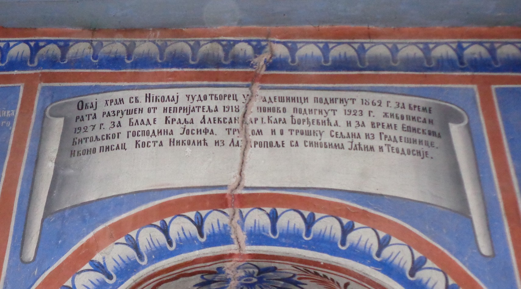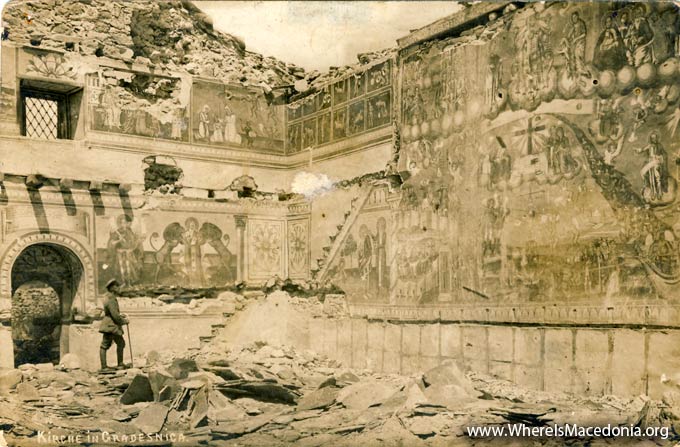The Early Modern Church of Sveti Nikola (St. Nicholas) in the village of Gradešnica was built in the year 1862. On a German photograph from the First World War we are able to discern that the church was severely damaged during the fierce fighting along the Salonica Front. A Serbian inscription above the entrance states that the enemy destroyed the church in 1918 and that it was restored in 1923 during the reign of the King of Serbs, Croats and Slovenes Aleksandar I Karadjordjević (reigned 1921-1934).