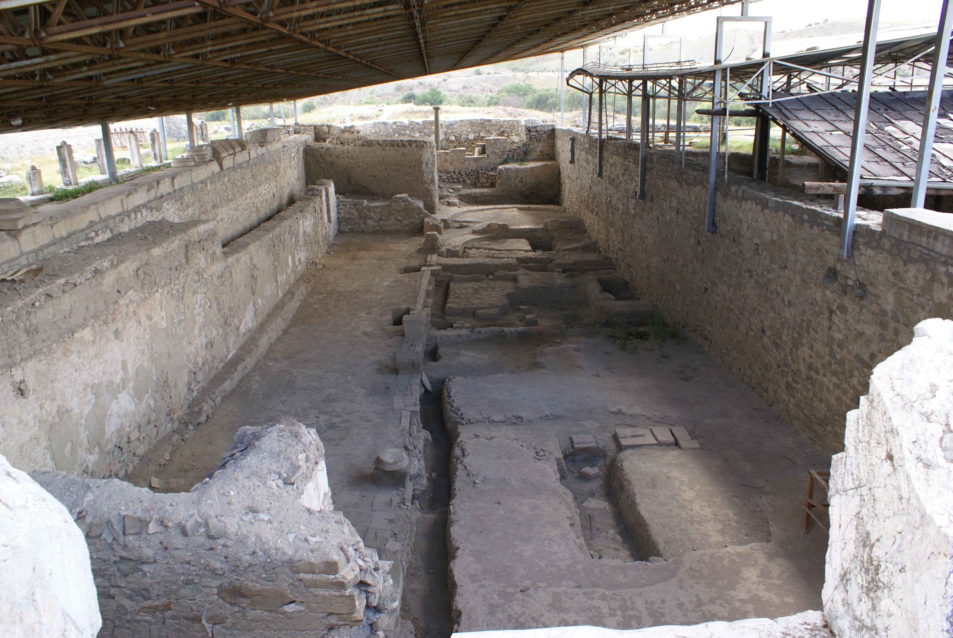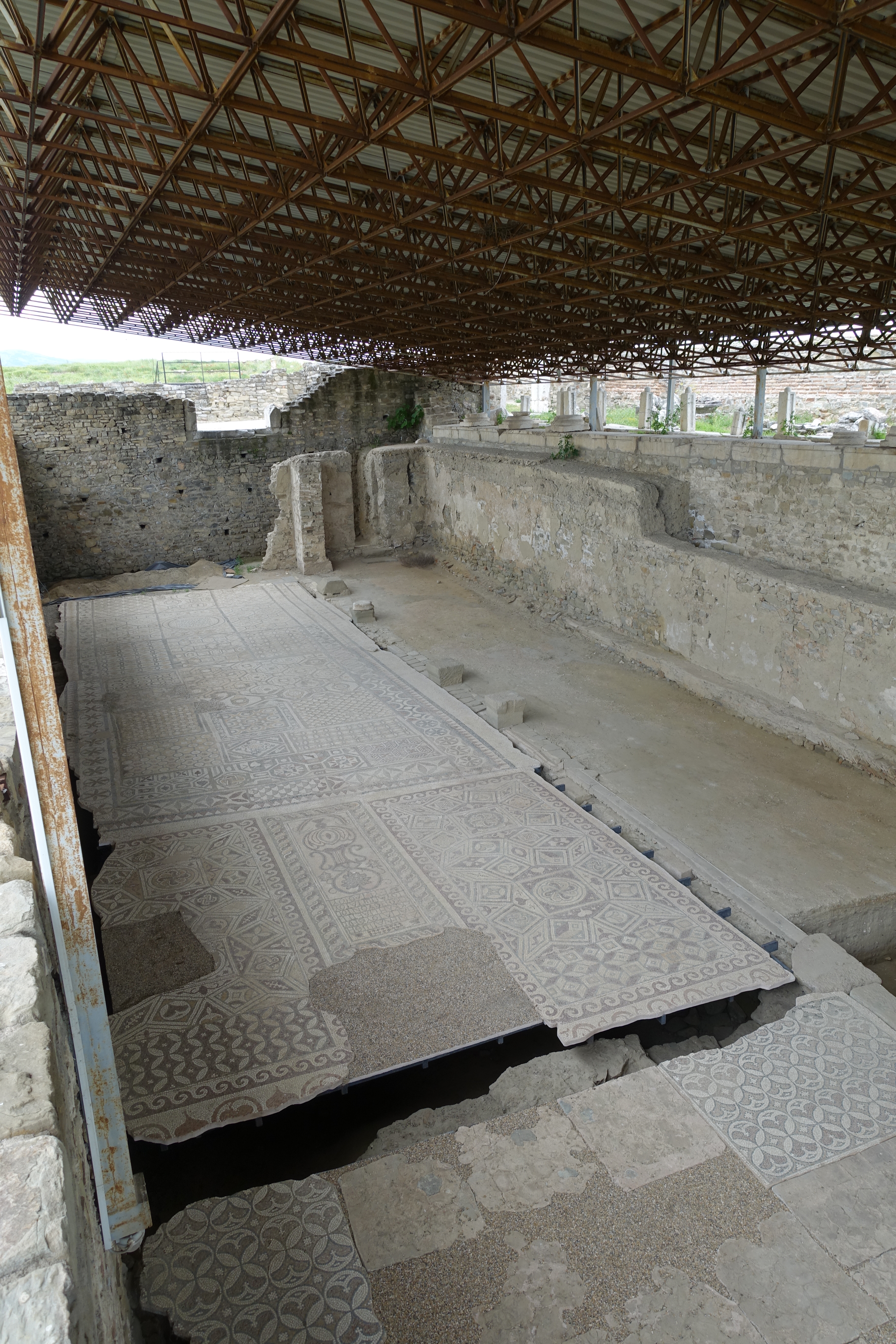 The (old and new) Episcopal Basilica is located to the West of the Roman Theatre in the Roman and Early Byzantine city of Stobi and was discovered by the German Army in 1917/18. It is the most important Christian monument in Stobi and was built in two phases. In the first phase, the old Episcopal Basilica was built in the first half or the middle of the 4th century. It had three naves, and the side naves were separated from the main nave by columns. In the second half of the 4th century, this basilica was extended to the East (narthex). The floor features a mosaic with geometric motifs and an inscription in the naos, which testifies that Bishop Eustathios renovated the church. In addition, remains of 4th-century frescoes (with geometric motifs, depictions of Saints and animals) are preserved on the Northern and Southern walls. In the first half of the 5th century, the second phase of construction began with the erection of the new Episcopal Basilica. This is evidenced by a Greek inscription on a lintel above the entrance to the naos, which names a bishop Philippos as the builder.