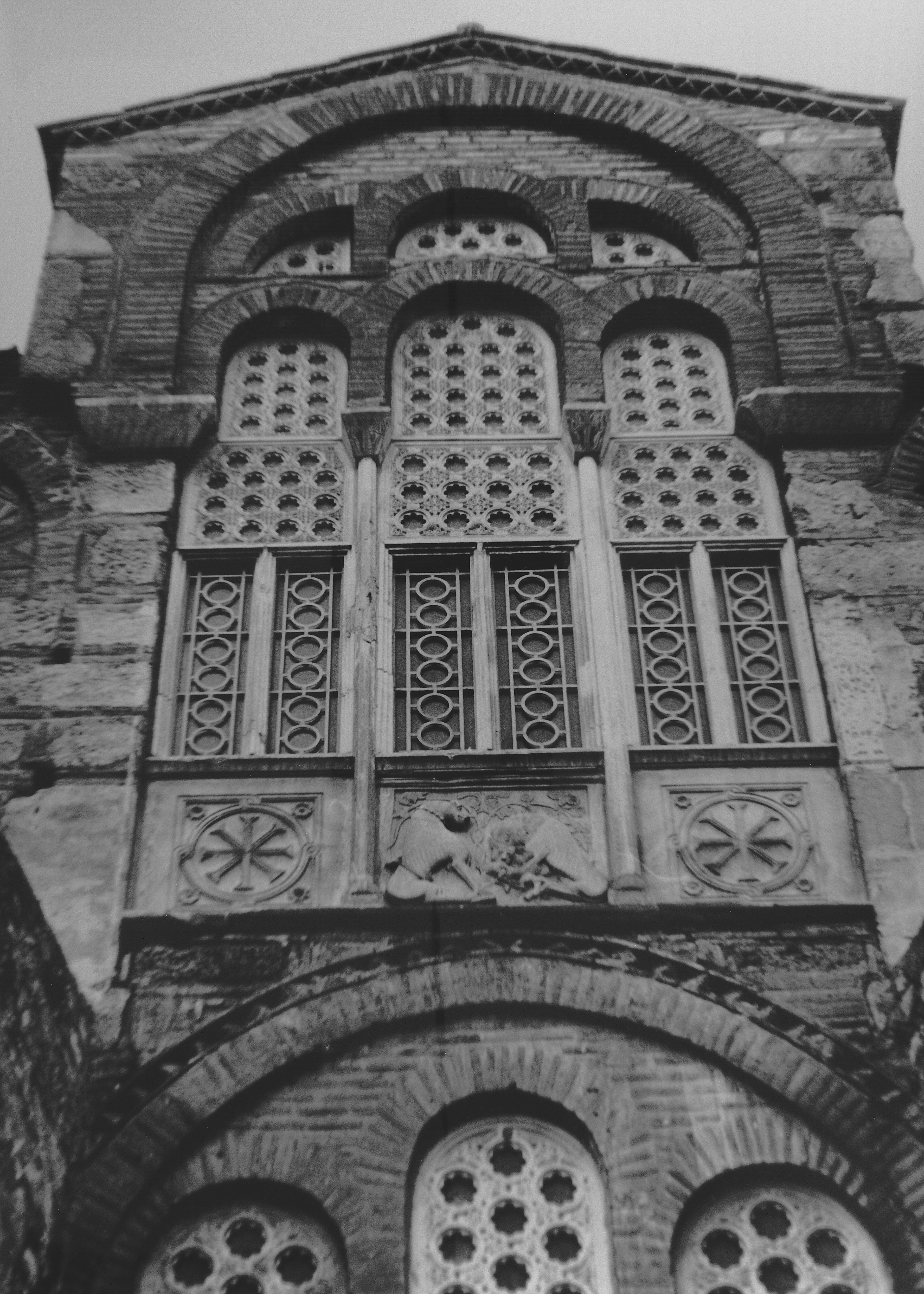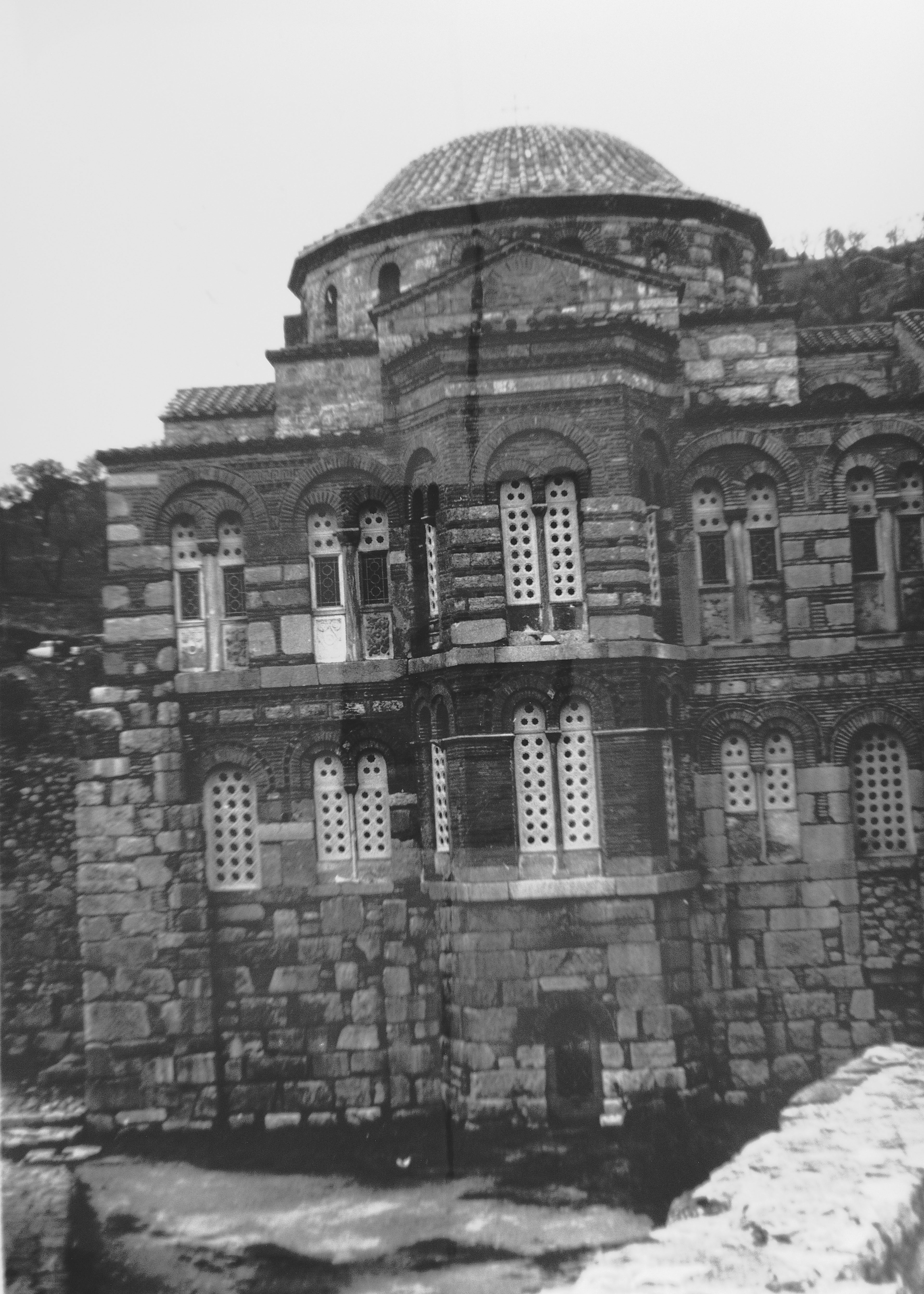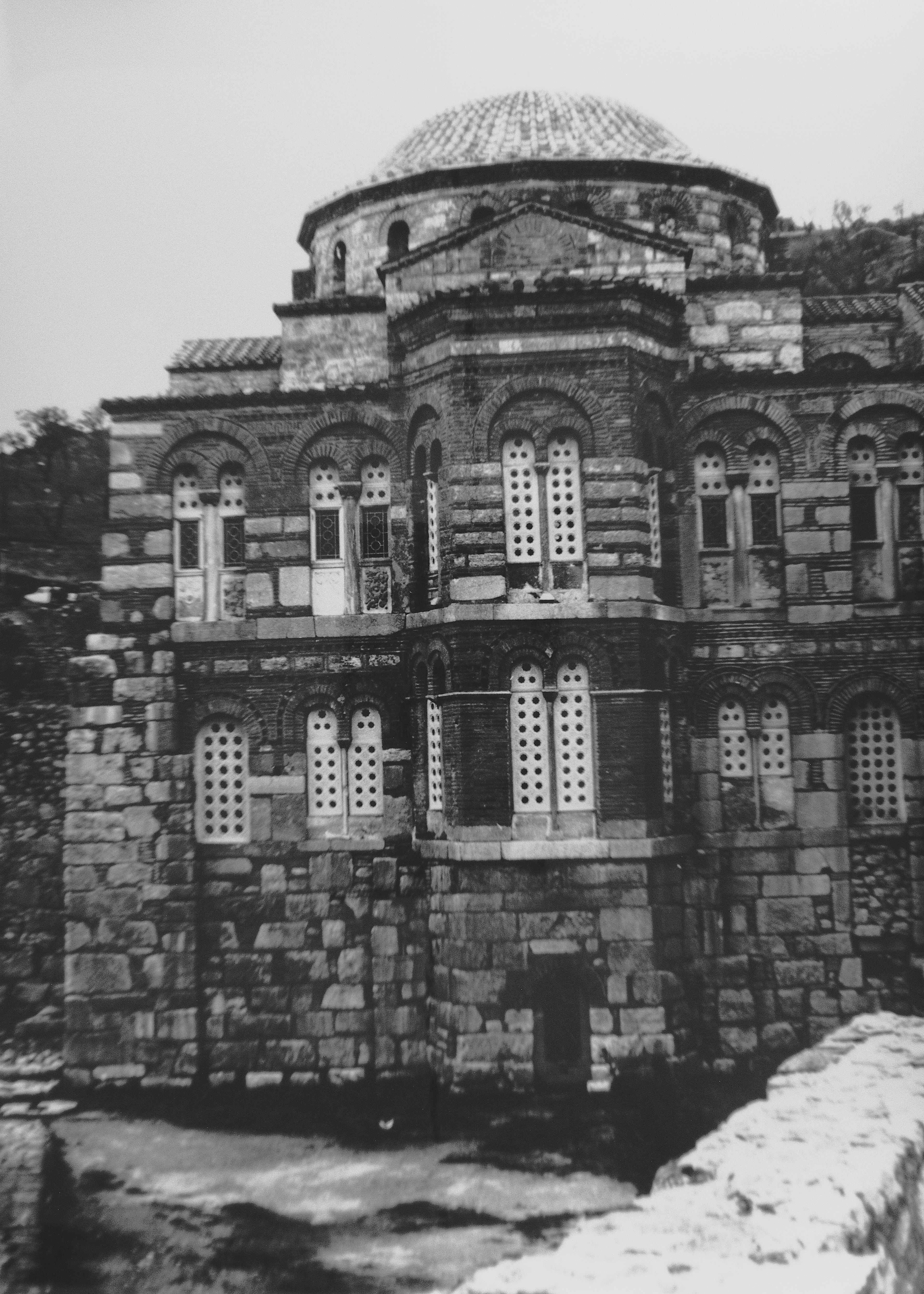 Mon.: Der die Außenmauer bildende Zellentrakt nur teilweise erhalten; in der Mitte freistehend das dem Hos. Lukas geweihte Katholikon, eine kreuzförmige, oktogonale Trompenkirche, wahrscheinlich Mitte 11. Jh. (,‚unter Könstantinos Monomachos“) erbaut, mit einer außen dreiseitigen Apsis. Neben der auf acht Stützen ruhenden Hauptkuppel eine kleinere über dem Presbyterium; w. anschließend Narthex; der schmale, rechteckige Exonarthex aus dem 12. Jh. im 19. Jh. vernichtet Innenausstattung: Marmorfußboden u. -wandverkleidung bis zum Gewölbeansatz; steinerne Ikonostase des 11. Jh.; Wandverkleidung über Gewölbeansatz Mosaiken des 11. Jh.; gleichzeitige Fresken in einigen Seitenkapellen u. in der Empore — Unter dem Katholikon als Krypta die ursprüngliche, kreuzförmige Grabeskirche des Hl., erbaut um 955, mit Gräbern von Äbten (nicht Kaisern) u. Fresken des 11. Jh. — An die Nordwand des Katholikon z. T. angebaut die Koimēsis Theotoku, Kreuzkuppelkirche (Viersäulentyp) mit drei außen dreiseitigen Apsiden, Lite u. Exonarthex; Kuppel nachbyz. umgebaut; Kästelmauerwerk mit pseudokufischen Ornamenten; nur wenige Fresken des 12.—13. Jh. erhalten; Marmorfußhoden. Die Marienkirche jedenfalls älter als das Katholikon u. wahrscheinlich mit der Barbarakirche zu identifizieren — Trapeza freistehend s. des Katholikon, Eingang von W, stark restauriert. — An der Südwestecke der Klostermauer Glockenturm, im Erdgeschoß ursprünglich Brunnenanlage, darüber kleine, quadratische Kapelle, Oktogonalbau mit Kuppel u. außen dreiseitiger Apsis, 11. Jh.