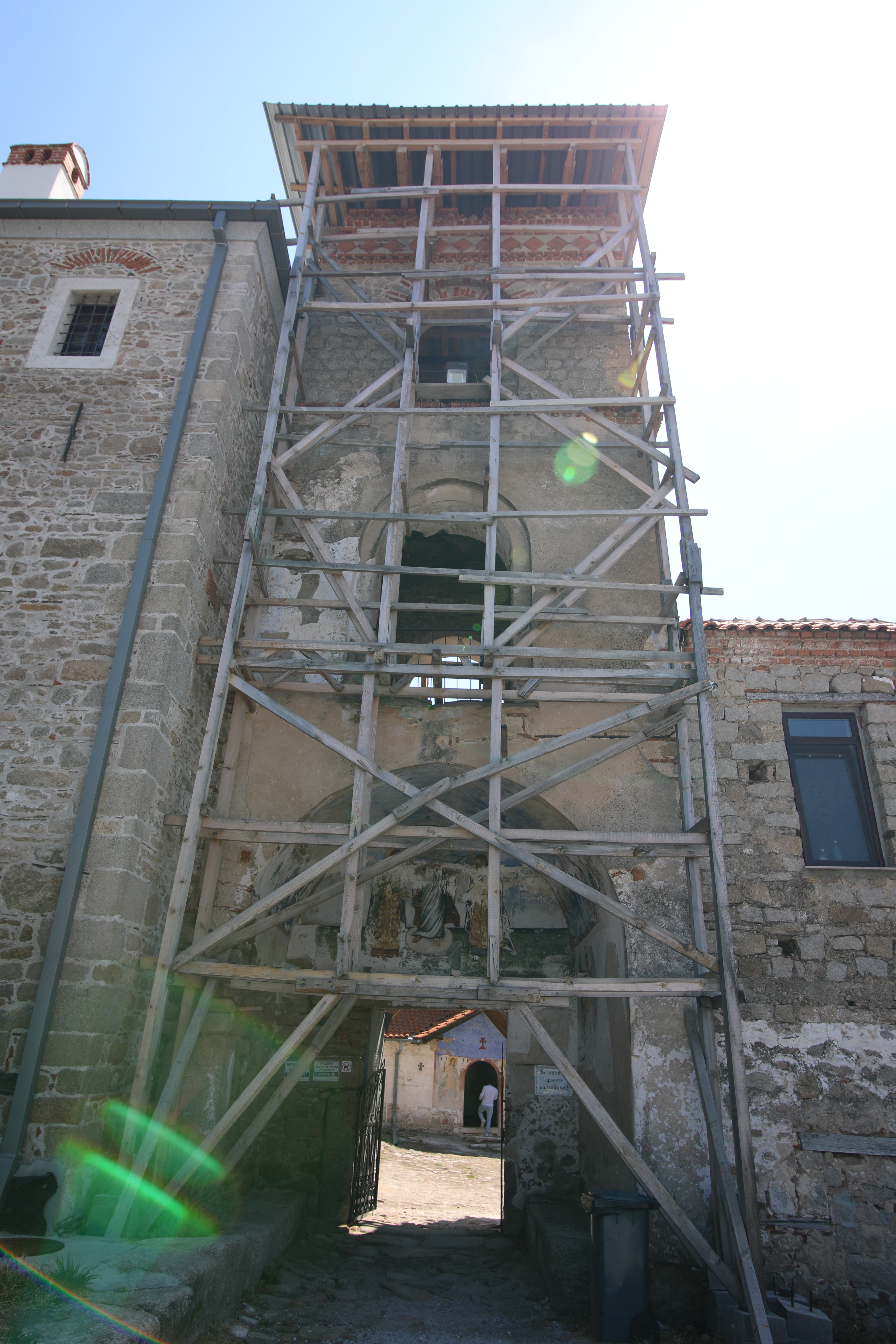 Second fresco layer: three frescoes in the vestibule of the main entrance to the monastery, formed on the ground floor of the bell tower constructed to the west of the Church of the Dormition of the Virgin. The frescoes were created in 1898, but there is a strong basis for the claim that they replicate the painting program depicted in the same location at the end of the 13th or the beginning of the 14th century. 1. Theotokos in the center, crowning the Byzantine emperors Andronikos II Palaiologos and Michael IX , 2. remains of the founder's composition: a part of the head of a female figure with a halo, facing to the right, and next to her, the so-called model of the church. This is a representation of the Theotokos, and the model undoubtedly was held by the ktitor (founder), whose figure, now completely destroyed, was located opposite the figure of the Mother of God. The destroyed fresco probably depicted the Byzantine military commander Michael Glabas Tarchaneiotes, 3. the figure of archangel Michael