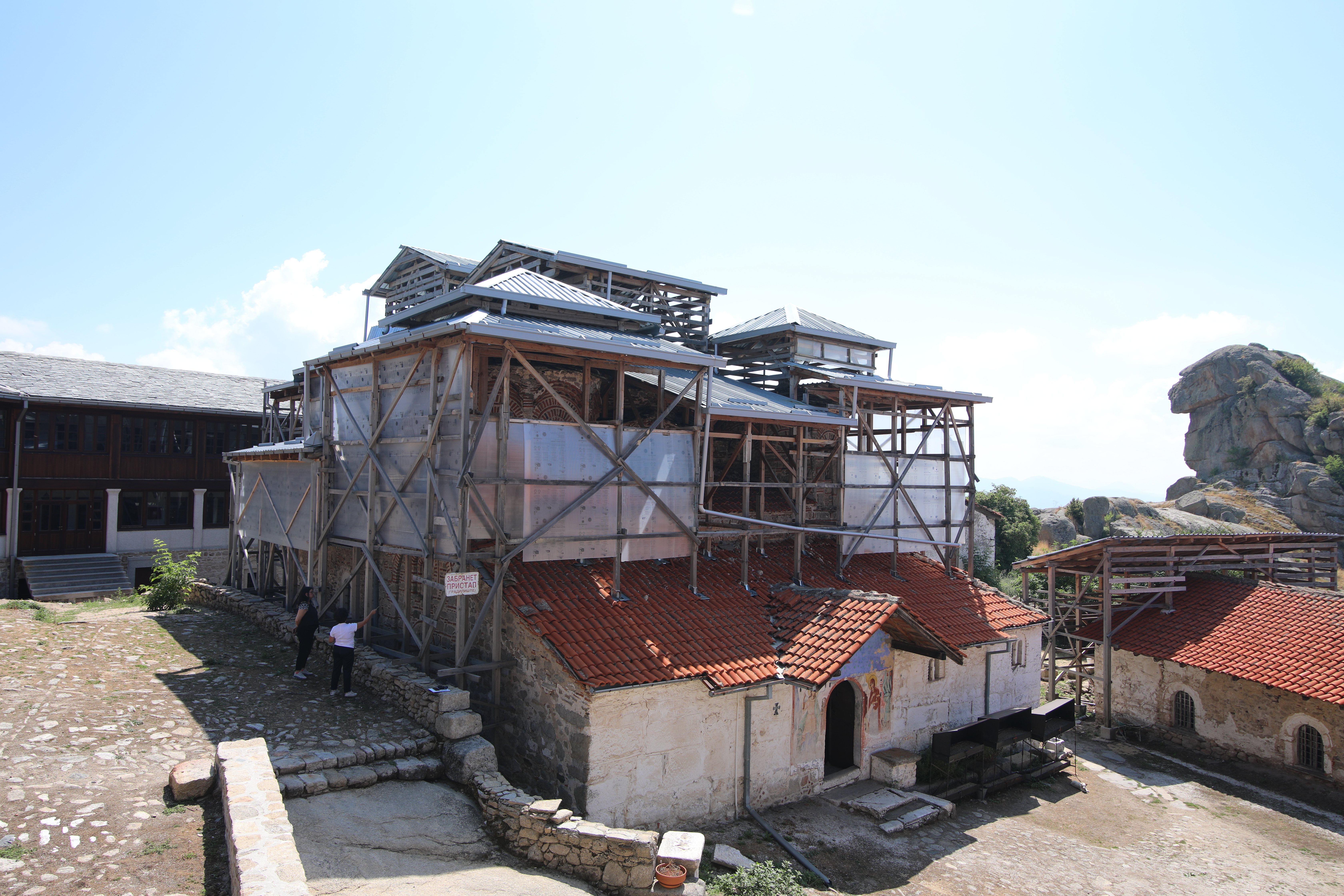 The monastery of the Holy Virgin known as Treskavac is located at a ten-kilometre distance from Prilep, below a rocky mountain peak. The oldest part of its katholikon, dedicated to the Dormition of the Holy Mother of God, dates back to the end of the twelfth century or the first half of the thirteenth century, whereas considerable construction works in the same church were carried out during the reign of Andronikos II and several decades later, between 1330 and 1350. The katholikon of the Treskavac Monastery is a complex architectural ensemble. The appearance of the church is the result of numerous constructions, alterations, demolitions, and renovations over the centuries. The spatial plan and structure of the church consist of several architectural units: the main church (altar and naos) with a narthex. Along the southern side of the church, the southern nave extends the entire length, while on the northern side, there is a northern side chapel, and on the western side, a two-domed narthex is situated. To this layout of the church, two additional spatial units are added - a southeast chapel and an enclosed porch encompassing the western and southern sides of the church complex.